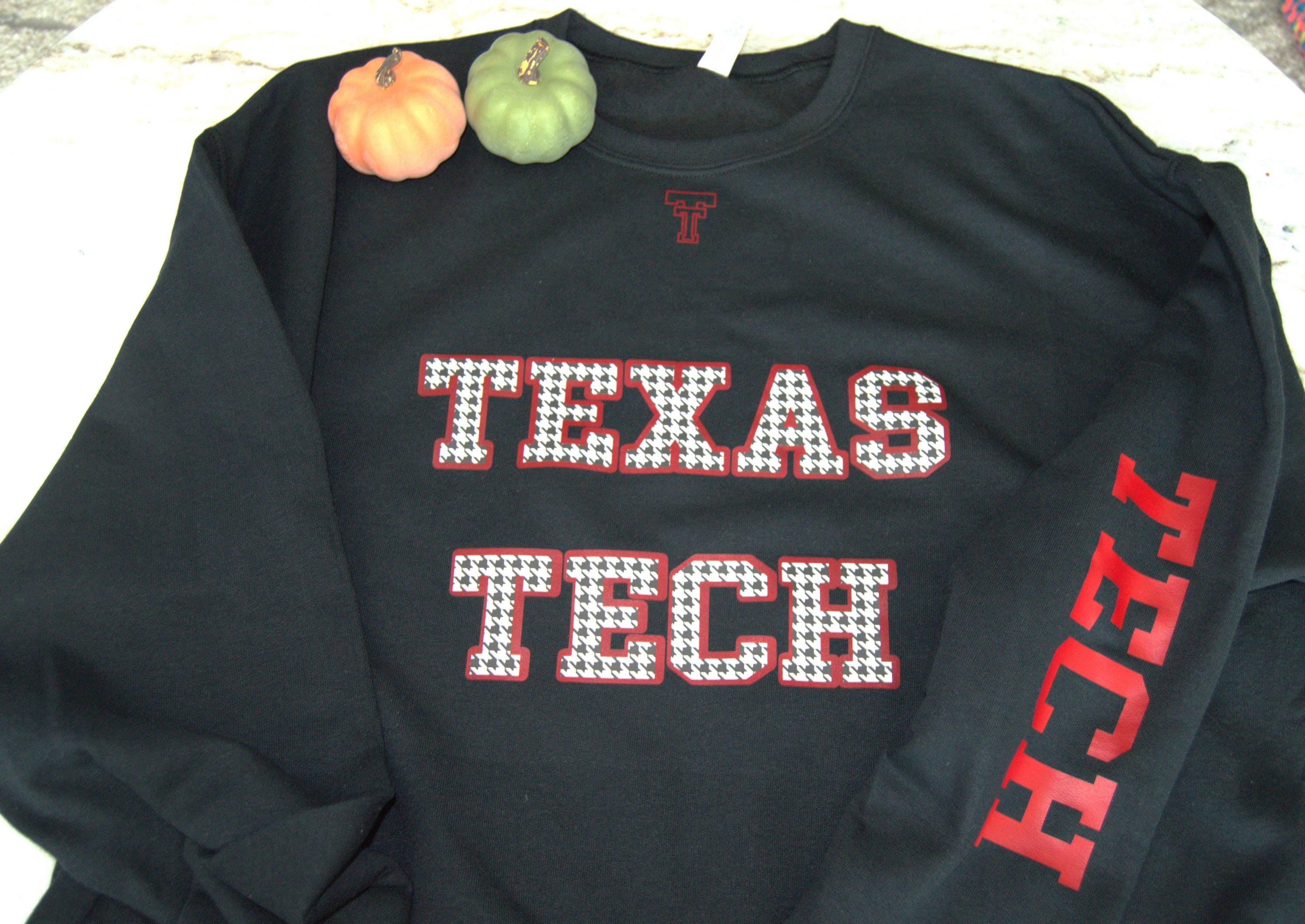 Get your spirit wear for all your fall football games, parties and tailgating. Perfect for fall evenings. Sweatshirt in black, with Red and black and white lettering. Tech down the side arm.