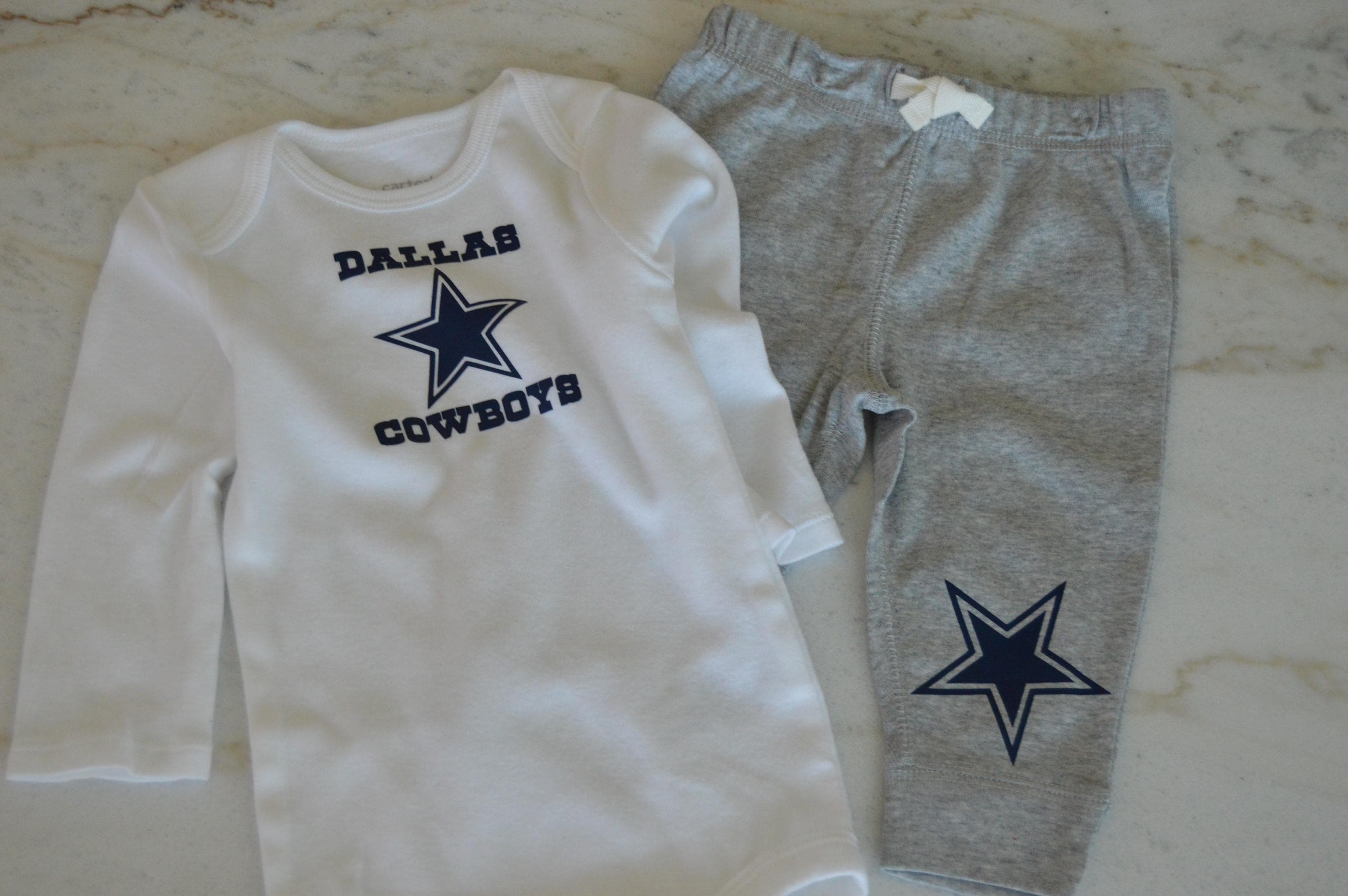 Get your Cowboys outfit for your little ones. This can be made for a boy or girl baby, available in sizes 0-3 and 3-6 months. Girl Cowboys has a football embroidered with Cowboys and Boy version has Dallas Cowboys with star. Perfect for Game Day. This makes a perfect gift for any one.