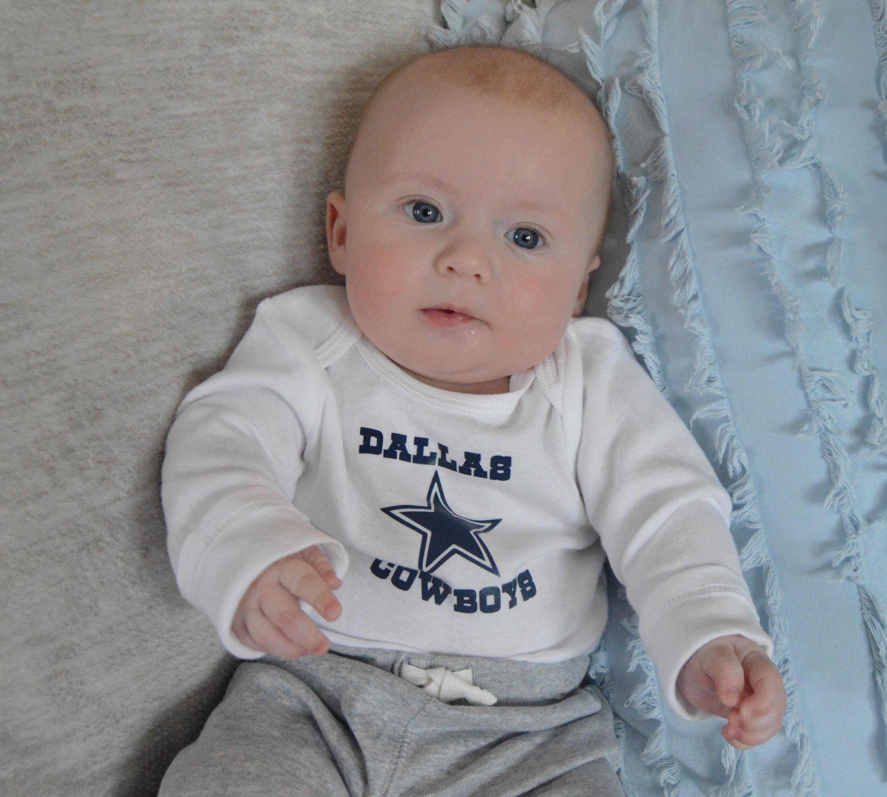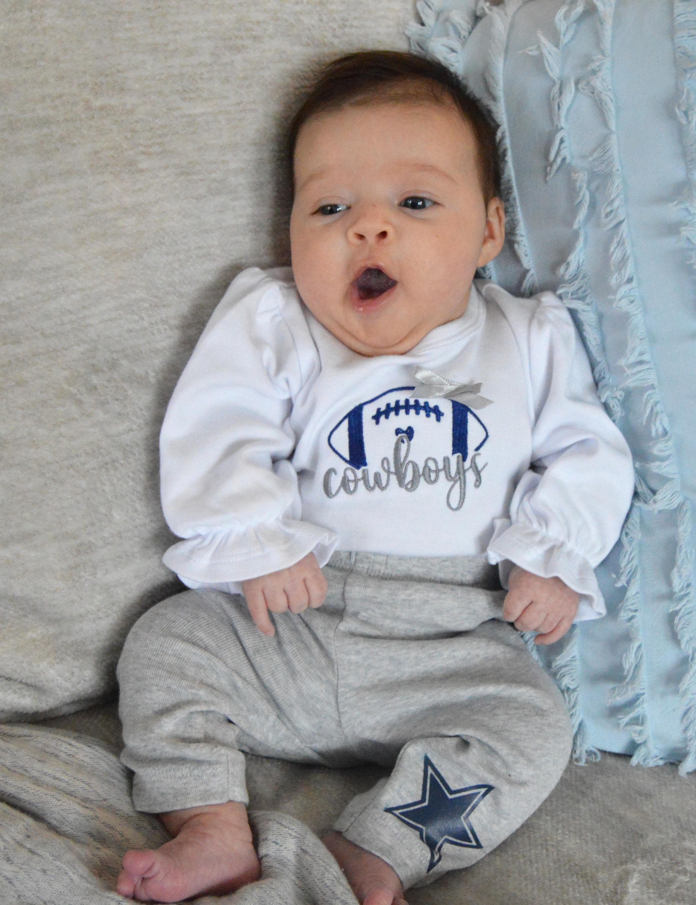 Get your Cowboys outfit for your little ones. This can be made for a boy or girl baby, available in sizes 0-3 and 3-6 months. Girl Cowboys has a football embroidered with Cowboys and Boy version has Dallas Cowboys with star. Perfect for Game Day. This makes a perfect gift for any one.
