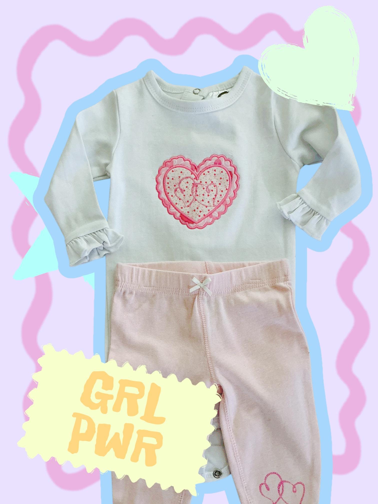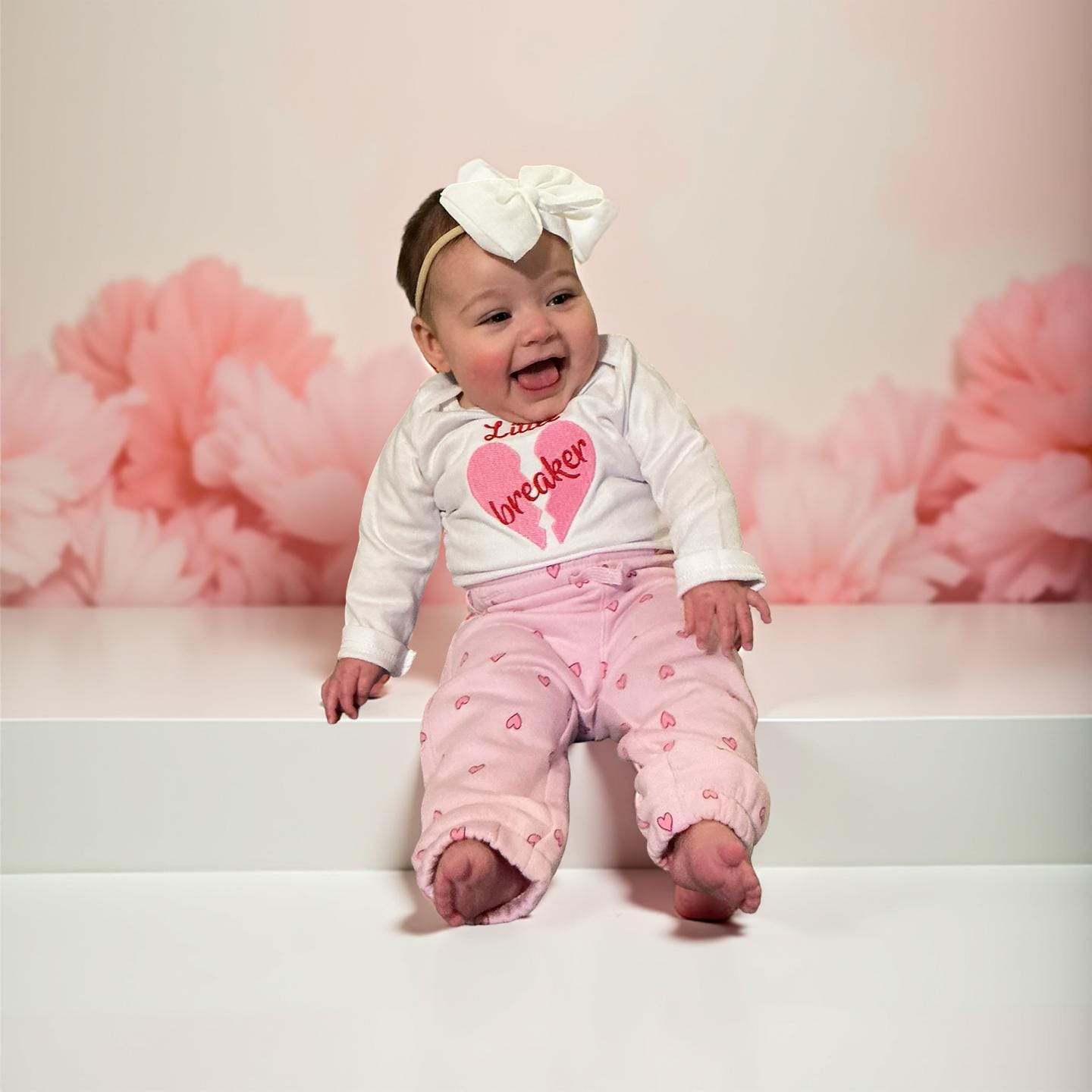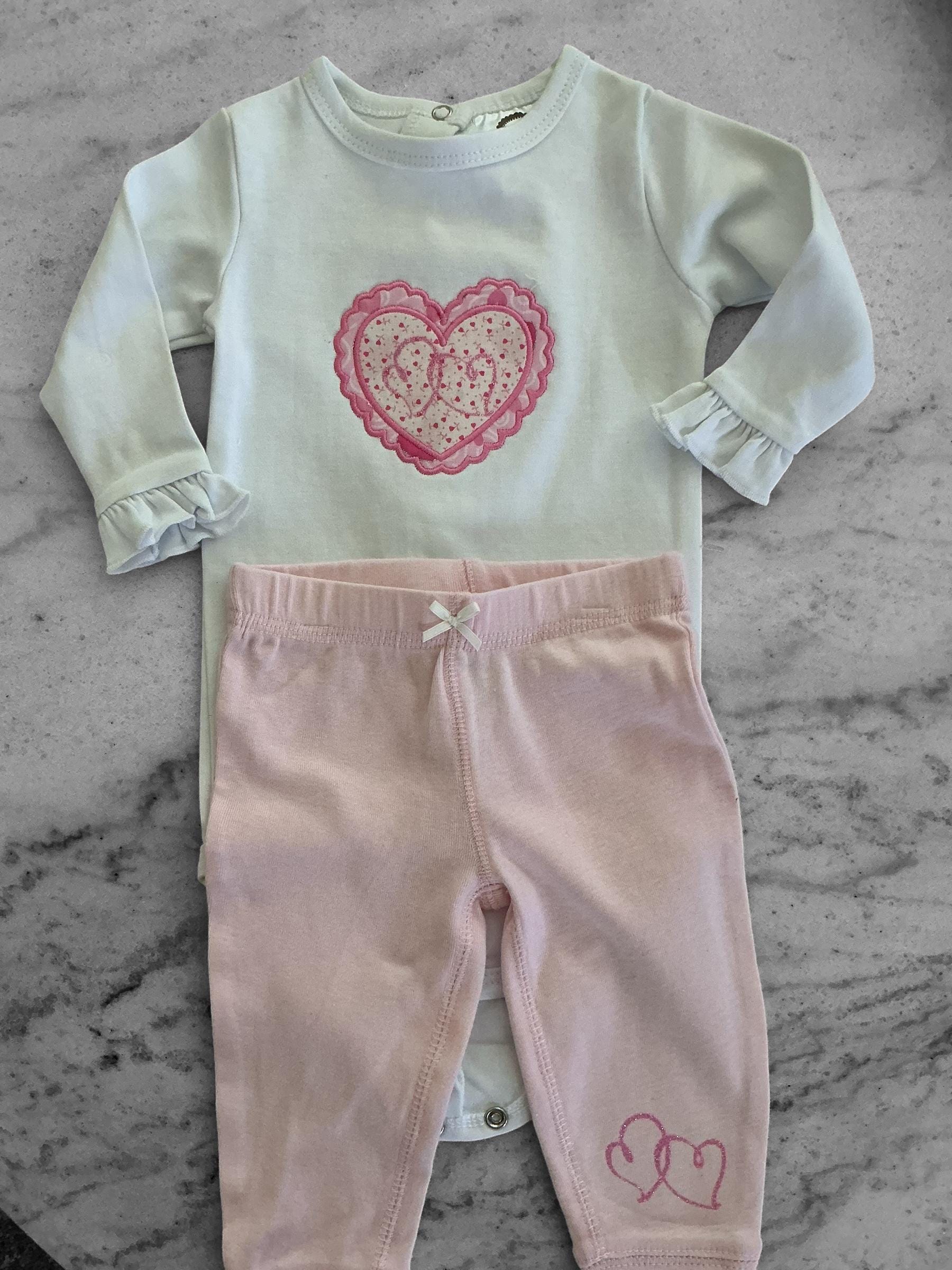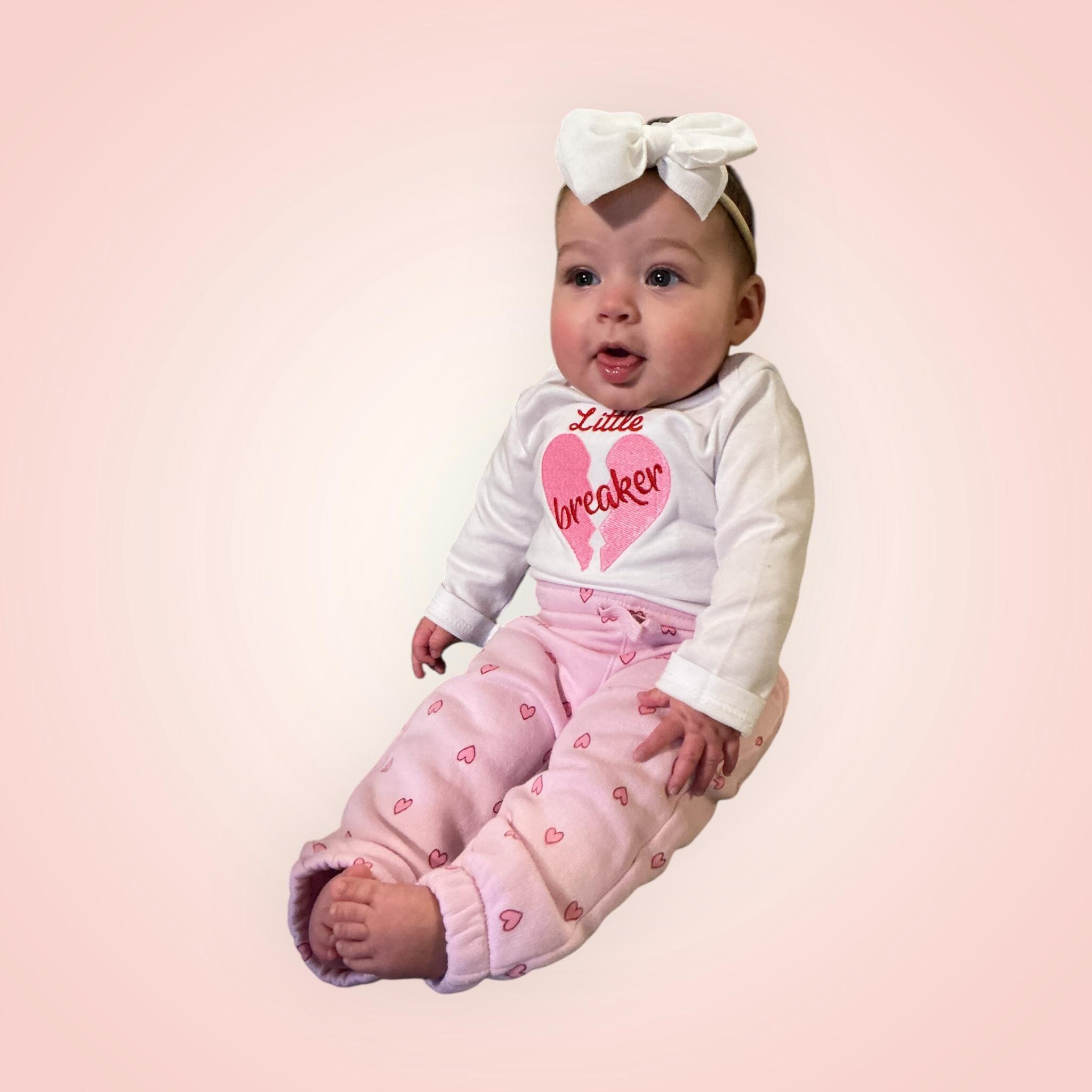 Little Heartbreaker embroidered design on a cotton onesie with pink leggings. Perfect for any time of year, but especially for Valentine's Day. So soft cotton next to babie's skin. Make a great gift for any one. Leggings may vary, but will always be pink.